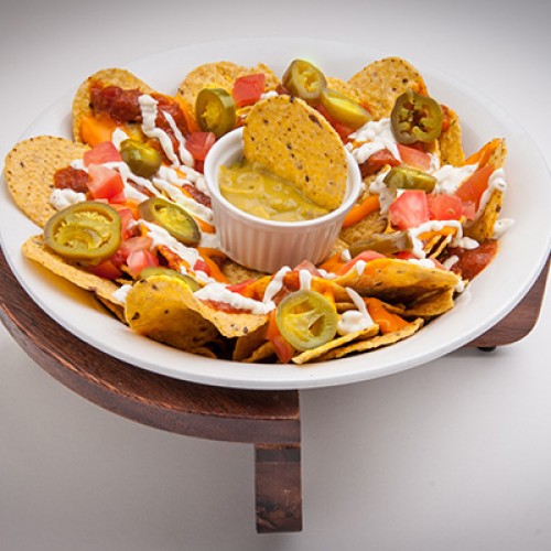 Nachos con queso cheddar fundido, dados de tomate natural, salsa bolognesa, salsa de yogur, jalapeños y guacamole.