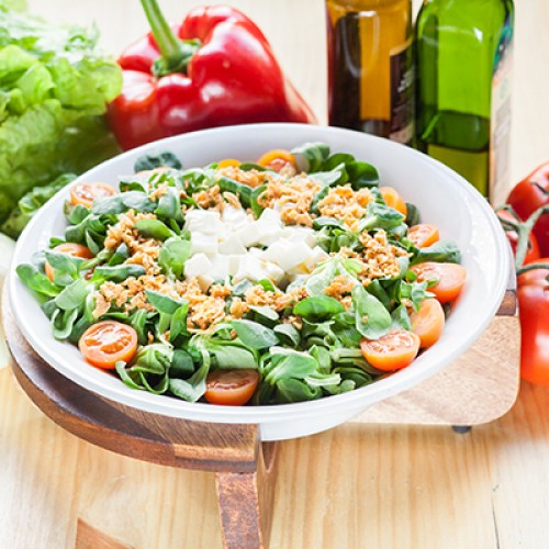 Canónigos, tomates cherry, queso fresco, cebolla crujiente, vinagre de Módena y aceite de oliva